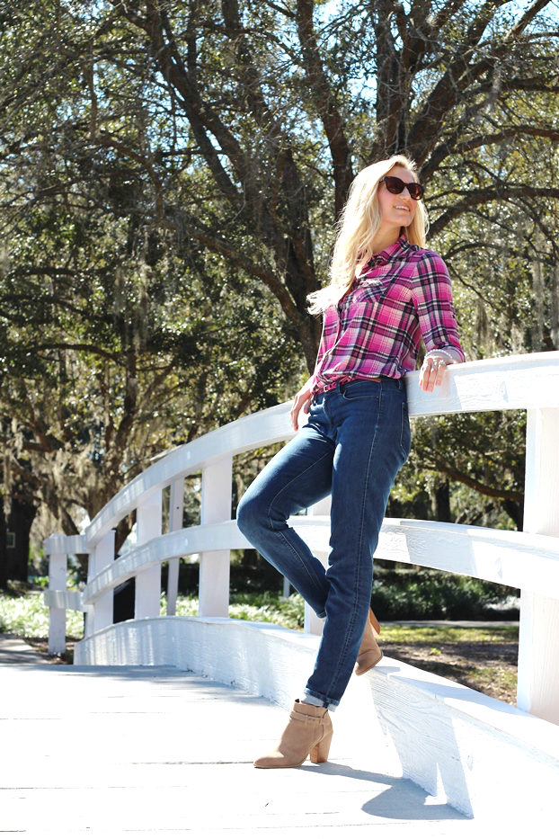 I don't typically wear a lot of plaid, and while I maintain a classic wardrobe and look most days, sometimes I like to experiment outside of my norm. Case in point: this pink plaid flannel shirt. I received a gift card for Christmas and decided to go for something different and because it was super soft and felt like pajamas, well I just couldn't resist! Since it was a casual day where I was running errands all over town coupled with working on proposals for clients at home, comfort and a punch of girly color was my goal for this look.